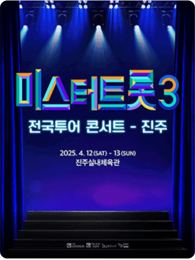 전국을 트롯의 열기로 물들일 미스터트롯3 전국투어 콘서트가 화려하게 개최되고 있습니다. TOP6의 직접 꾸미는 무대로, 눈과 귀를 사로잡는 퍼포먼스와 진정성 있는 노래가 어우러져 관객들에게 잊지 못할 감동을 선사합니다. 전회차 전석 매진, 총 1만 4천여 명의 관객과 만났던 서울 콘서트! 전국 주요 도시에서 펼쳐지는 이번 콘서트는 남녀노소 모두가 즐길 수 있는 최고의 트롯 축제! 라이브의 전율, 트롯의 매력을 새롭게 쓰는 미스터트롯3의 여정을 지금 함께하세요!